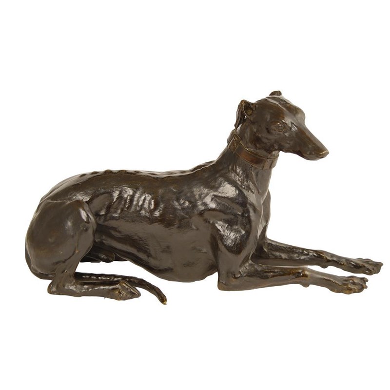 A bronze model of a reclining greyhound, 20th century, 11in (28cm) h, 21in (53cm) l.