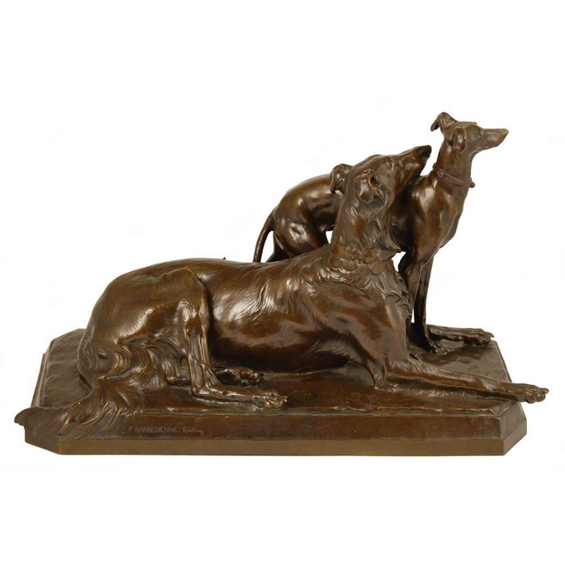 After George Gardet (1863 - 1939). Borzoi and Whippet, bronze, signed and cast by 'F.BARBEDIENNE, FONDEUR', 11in (28cm) h, 19in (48cm) l.