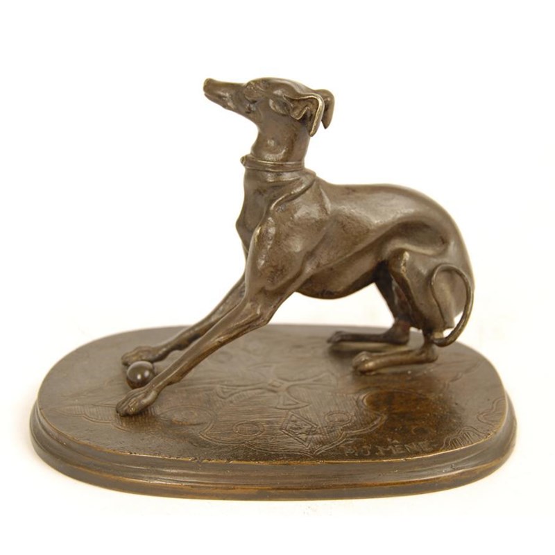 After Pierre Jules-Mene (1810-1879). Whippet with a ball, on an oblong base, bronzed iron, 4.5in (11.5cm) h, 6in (15cm) l.
