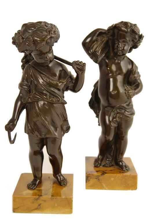 A pair of 19th century French bronze figures, of children harvesting, one with corn, the other with grapes, on Siena marble bases, 8.5in (21.5cm) h. (2)