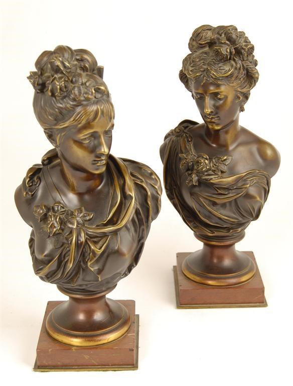 A Carrier. A pair of bronze busts, of young ladies with roses in their hair and on their robes, signed 'A.CARRIER,' on turned socles and square marble bases, French 19th century, 13in (33cm) h. (2)
