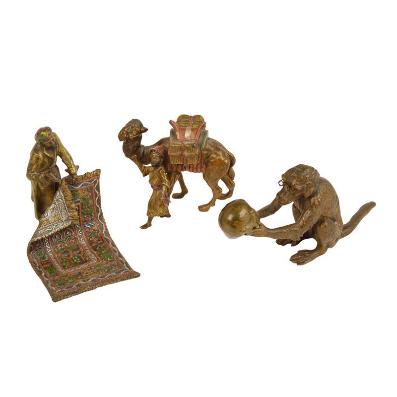 An Austrian cold painted model of a camel, with attendant, 3in (7.5cm) h, another figure a carpet seller and a third of a seated monkey holding and looking at a skull. (3)