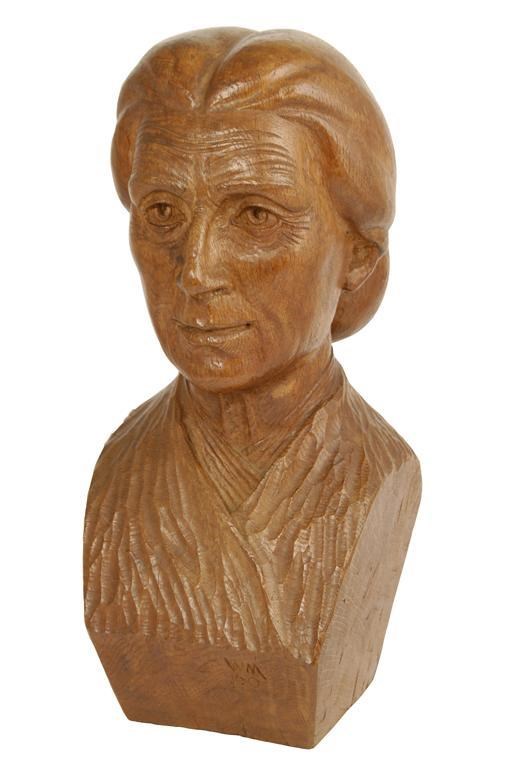 A carved oak bust of a lady, incised 'WM 60,' 16.5in (42cm) h.