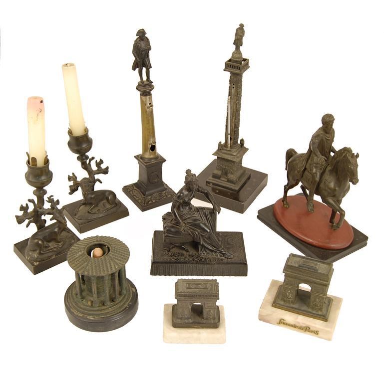 A pair of late 19th century bronze candlesticks, with a recumbent stag and doe, 5.25in (13cm) h, a French desk thermometer modelled as the Vendome column, thermometer broken, another similar, two models of the Arc de Triomphe, a model of The Temple of Vesta,an equestrian model of the Marcus Aurelius and a seated classical lady. (9)