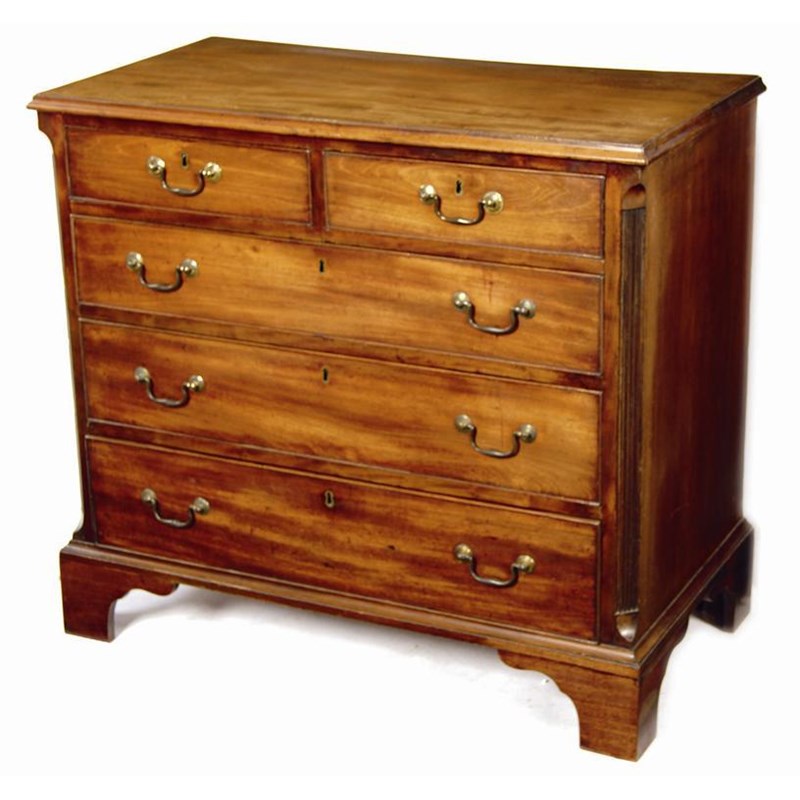 A George III mahogany chest, the moulded edge top above two short and three long graduated drawers flanked by fluted canted angles, on replaced bracket feet, 32.75in (82.9cm) h, 36.25in (92.2cm) w, 19.5in (49.6cm) d. Cracks to top and sides, restorations.