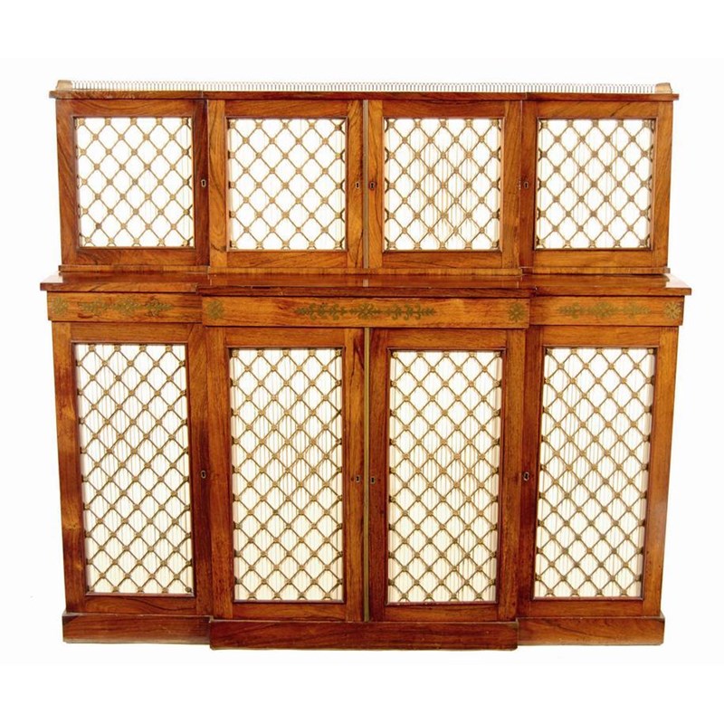 An early 19th century rosewood and brass marquetry breakfront chiffonier, in two parts, the top with a 3/4 brass gallery above gilt brass trellis doors, enclosing shelves and a plinth base, 53.75in (136.5cm) h, 59.5in (151.2cm) w, 15.5in (39.2cm) d. Veneer loss, locks replaces, hinges replaced to one door.
