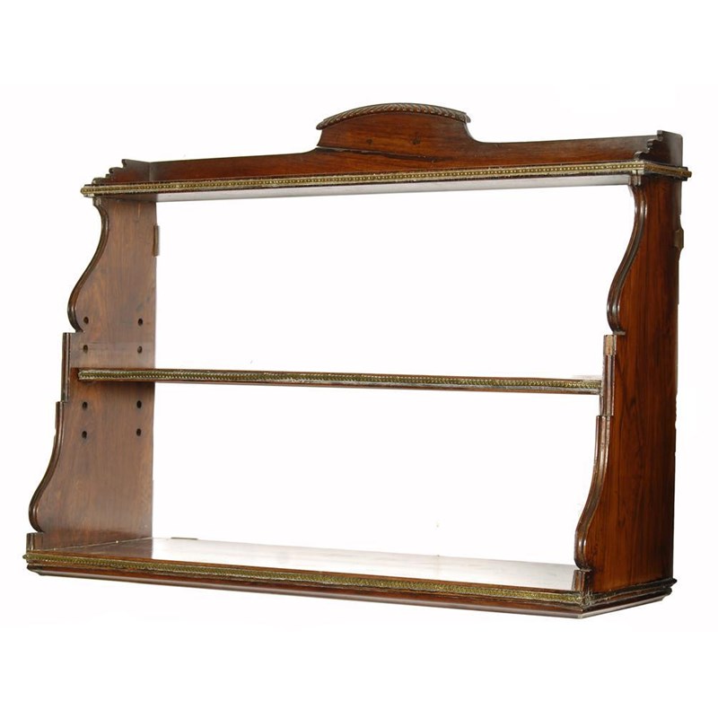 A set of William IV rosewood and brass mounted hanging shelves, the gadroon carved surmount to an adjustable shelf, 22,5in (57cm) h, 30.75in (77.7cm) w, 9.5in (24cm) d. Surmount cracked.