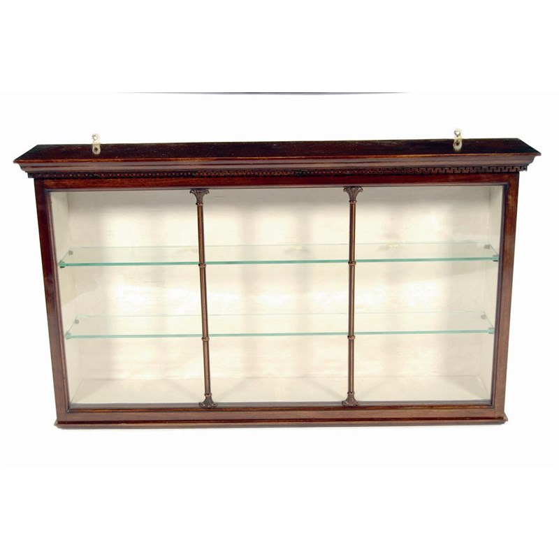 A mahogany hanging display cabinet, with a Greek key cornice to a glazed sliding door with column tracery bars, enclosing two glass shelves, early 20th century, 19.5in (49.6cm) h, 3.in(85cm) , 6in (5.5cm) d.
