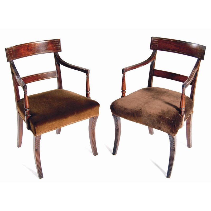 Two mahogany and brass inlaid open armchairs, with reeded decoration and acanthus capped sabre legs, one Regency and one modern. (2)