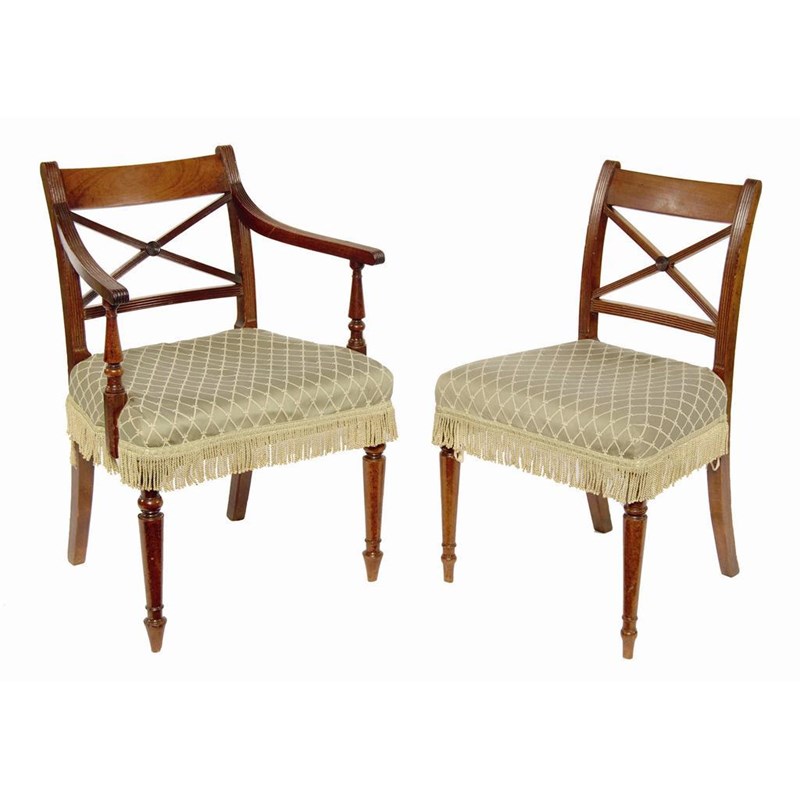 A set of seven early 19th century dining chairs, each with an 'X' back and on turned tapering front legs, comprising: six side and one open armchair. (7) Old damages.