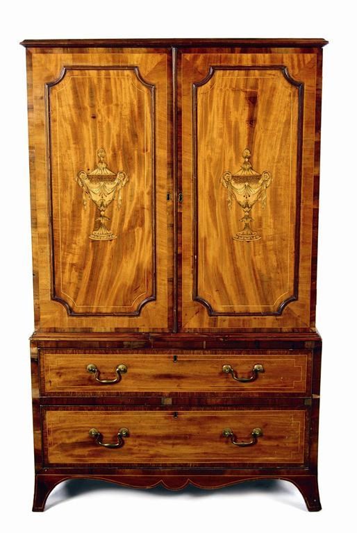 A mahogany and marquetry small linen press, the rosewood crossbanded moulded edge top above a pair of panelled doors inlaid urns, enclosing two adjustable shelves, the base with two long drawers stamped 'EDWARDS & ROBERTS', with brass side carrying handles, 54.25in (137.8cm) h, 33in (84cm) w, 20in (51cm) d. Some restoration.