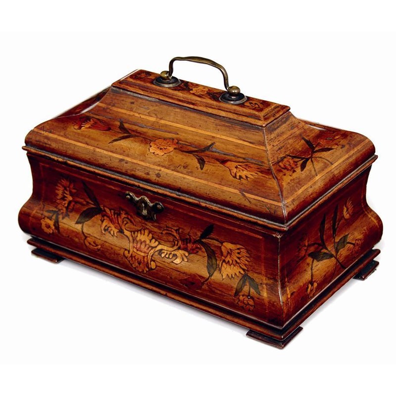 An 18th century Dutch walnut and floral marquetry ogee shaped tea caddy, of rectangular form, the hinged cover with a brass handle revealing a pair of brass lidded canisters flanking a hinged lidded canister, with recess behind on later block feet, 6.5in (16cm) h, 10in (25.5cm) w.
