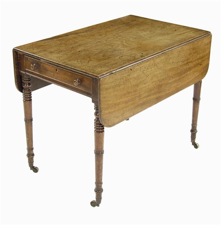 An early 19th century mahogany Pembroke table, fitted a frieze drawer, dummy to the reverse, on ring turned legs, brass caps and castors, 27.75in (70.5cm) h, 35.75 x 41.75in (90.7 x 106cm) open.