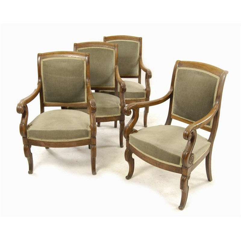 A set of four Louis Phillippe walnut fauteuil, with lappet scroll carved supports. (4)
