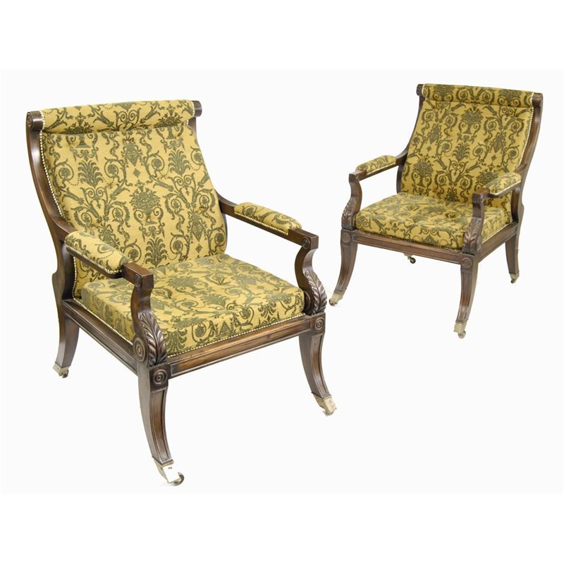 A pair of mahogany library open armchairs in Regency style, with foliate carved supports on brass caps and castors, 20th century. (2)