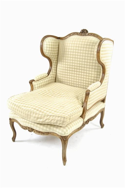 A large Spanish walnut wing armchair, the moulded frame carved with leaves and flowers, on cabriole legs, early 19th century. Old worm holes, front right leg replaced.
