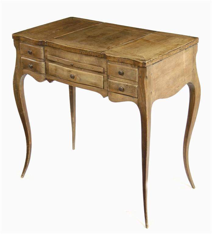 A French walnut dressing table, the hinged with an adjustable mirror and two compartments above a slide and two drawers, 28.5in (72.5cm) h, 29.5in (75cm) w, 16.5in (41.5cm) d.