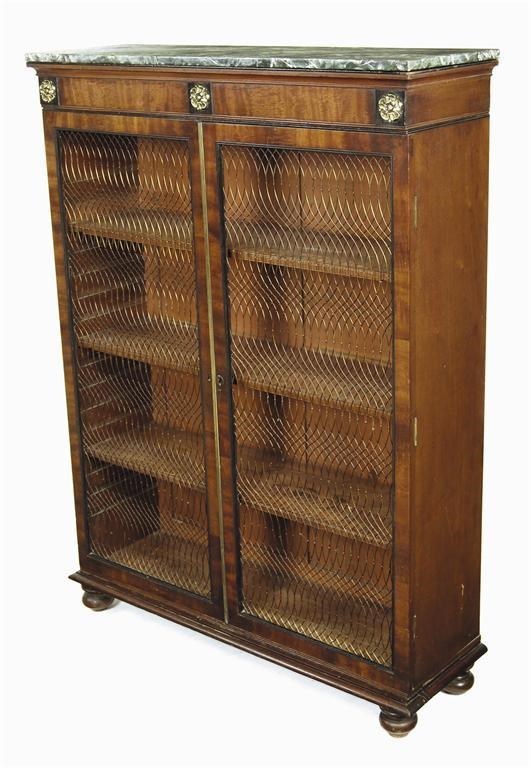A 19th century mahogany bookcase, with a later faux marble top above a detachable cornice with applied brass rosettes, to a pair of brass grille doors enclosing three adjustable shelves, on bun feet, 54.75in (139cm) h, 40.75in (103.2cm) w, 12.75in (32cm) d.