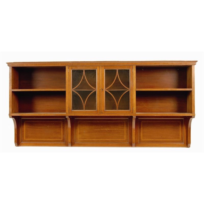 An Edwardian mahogany wall cabinet, inlaid stringing with a pair of astragal glazed doors flanked by shelves, 38.5in (97.6cm) h, 83.5in (212cm) w, 12in (30.2cm) d.