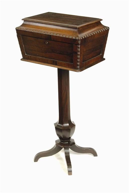 A rosewood sarcophagus shape pedestal sewing box, having a plush lined interior with a lift-out tray, 35in (89cm) h, 17.5in (44.5cm) w, 12in (30.5cm) d.