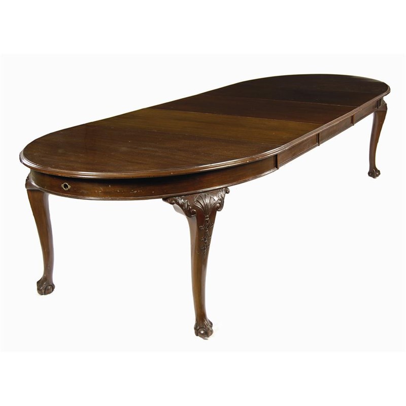 A mahogany extending dining table, the moulded edge top with three additional leaves, on shell and husk carved cabriole legs and on claw and ball feet, with a central support, late 19th / early 20th century, 31in (78.3cm) h, 47.75in (121.3cm) w, 141in (358cm) l. With winder.