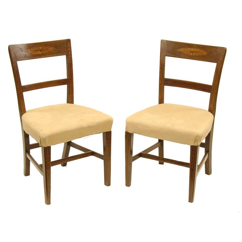 A set of four 19th century mahogany side chairs, each with a curved top rail inlaid a fan the supports with bell flowers. (4)