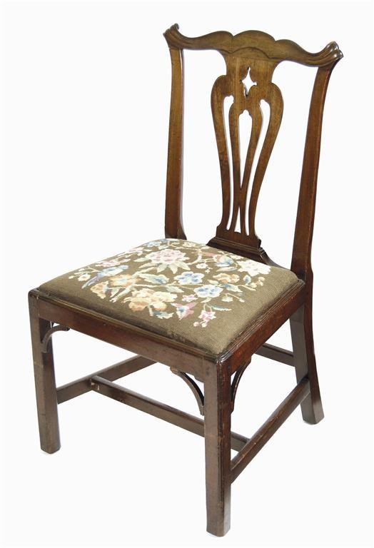 A George III mahogany side chair, with a pierced vase shapped splat and a later needlework covered drop-in seat.
