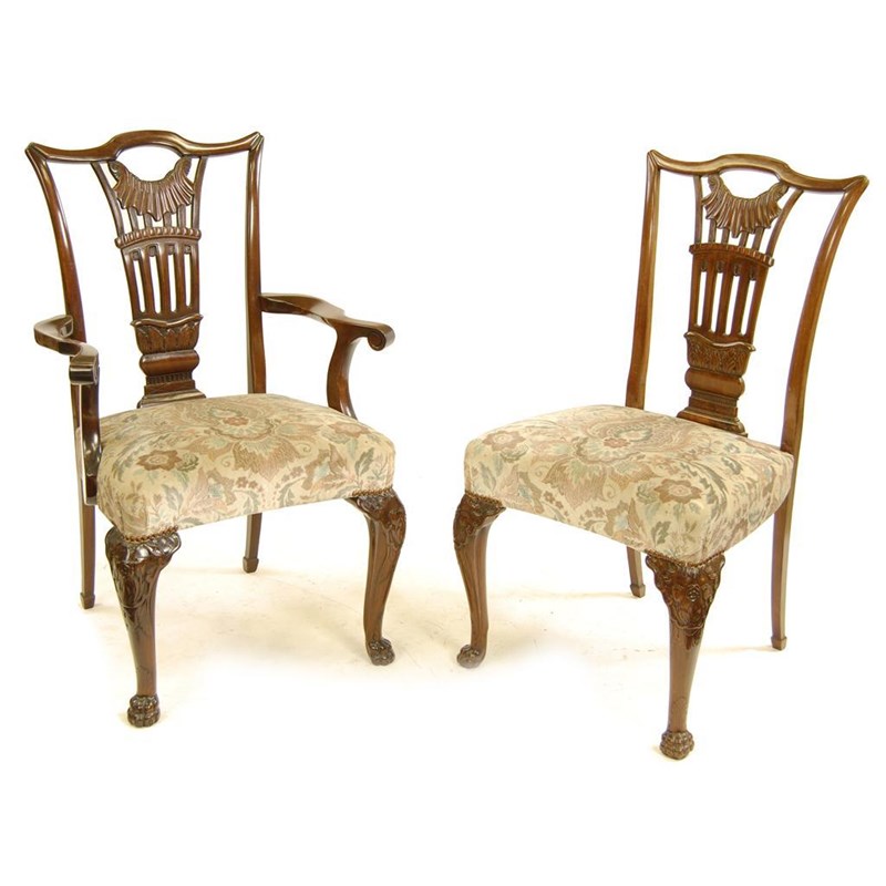 A set of six mahogany dining chairs in 18th century Irish style, each with a carved and pierced splat back above a stuffed over seat, the cabriole front legs with tulips on a diaper ground terminating in paw feet, comprising: a pair of open armchairs and two side, early 20th century. (6)