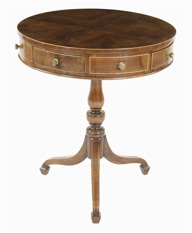 A mahogany drum table in George III style, inlaid stringing, the quarter flame veneered revolving top above four drawers and four false fronts on a turned stem, the underside stamped 'L3973, 186', late 19th century, 28in (71cm) h, 21.25in (61.4cm) dia.