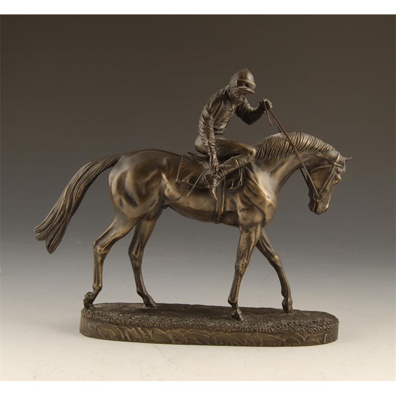 David Geenty (1945-). A cold cast resin and bronze finish group of a horse and jockey, the base stamped 'GEENTY '93, C.C. H', 10.5in (26.7cm) h, 12.75in (32.3cm) w. The horse's right ear lacking.