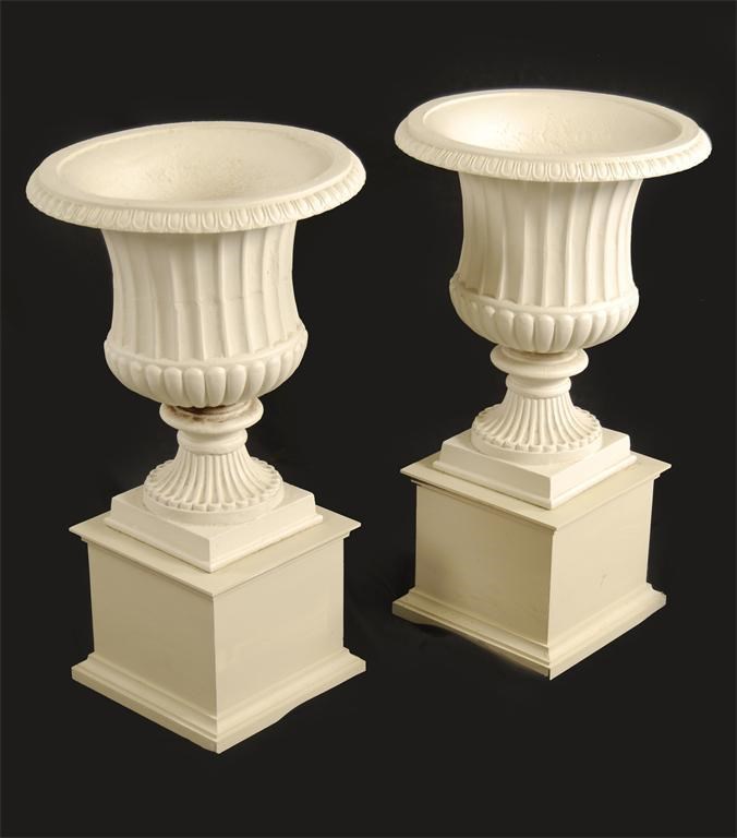 A pair of late Victorian cast iron garden urns, of fluted campana shape, later painted, on modern plinths, 27.5in (69.7cm) h, 16in (40.4cm) dia. (4)