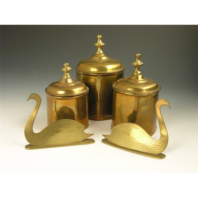 A 19th century Dutch brass octagonal tobacco jar, with a turned finial to the hinged cover, 8in (20cm) h, and two similar jars, and a pair of brass swan chimney ornaments. (5)