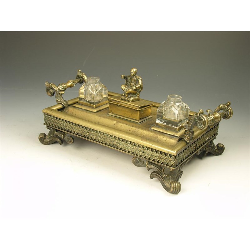 A 19th century bronze desk stand, having a central lidded compartment with a seated Chinaman finial flanked by two glass wells, scroll lifts to an applied trellis body on scroll leaf feet, 5.5in (14cm) h, 14.25in (36cm) w, 8in (20.5cm) d.
