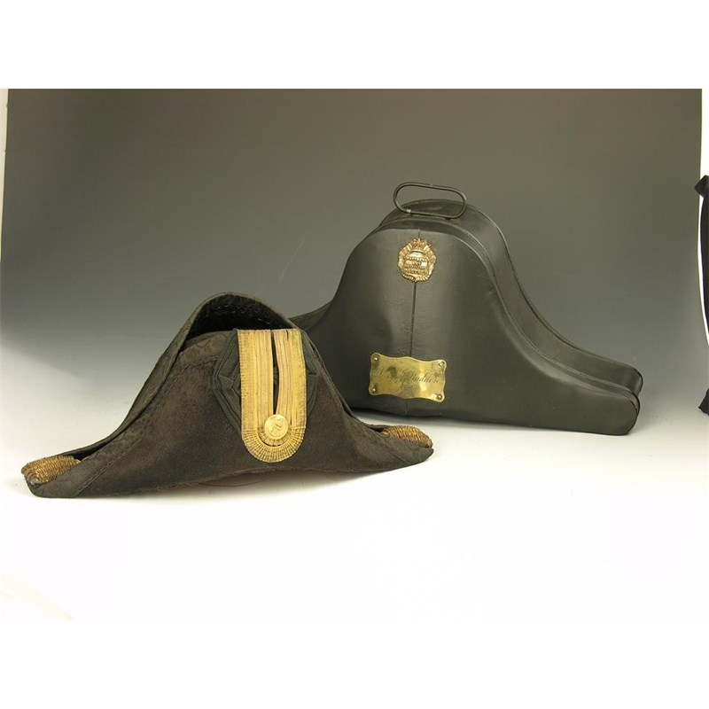 A naval bicorn hat, by Matthews & Co, Portsea, Portsmouth, size 6 7/8, 16in (40.5cm) w, in a fitted tin box with brass trade label and owner's plaque inscribed Dr H. J. Hadden, R. N. Box re-painted.