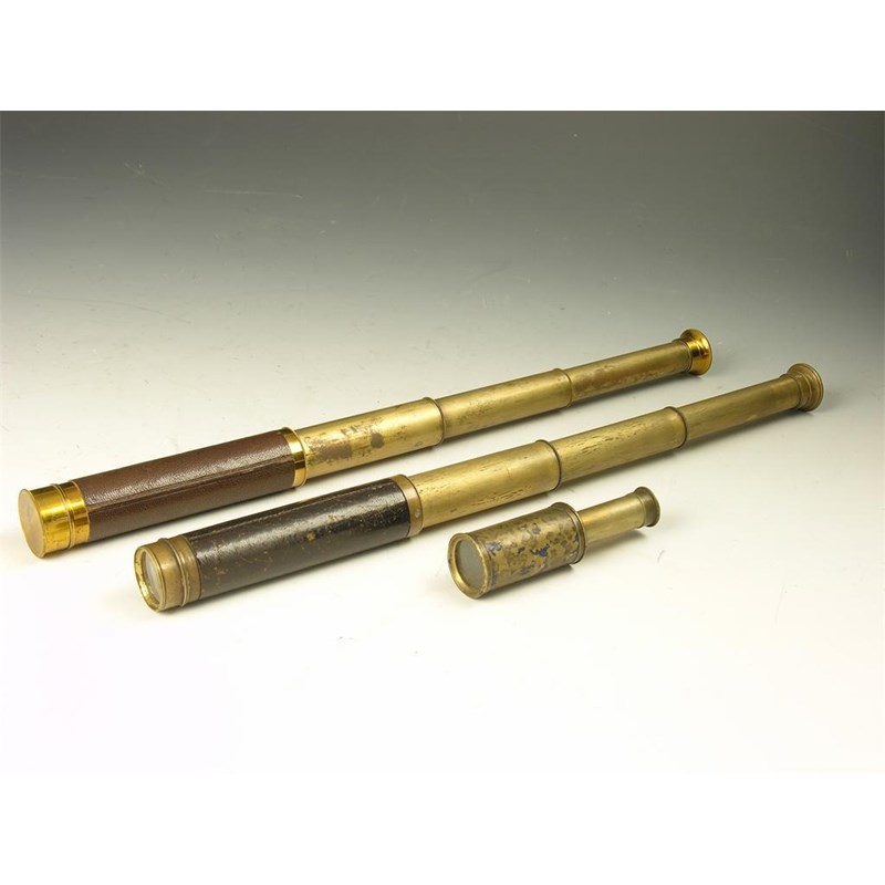 A Salom & Co Reconnoiterer brass three draw 1 inch telescope, with a leather grip, the end cap with paper trade label with a canvas case, worn, 5.75in (14.5cm) closed, another similar telescope and a third single draw telescope. (3)
