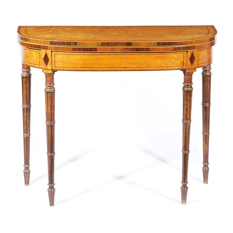 inlaid with stringing and with rosewood banding, the fold-over top on twin gate supports, with a baize lined playing surface, on ring turned legs
