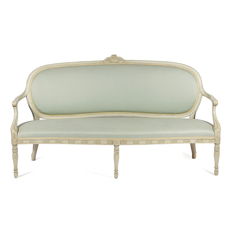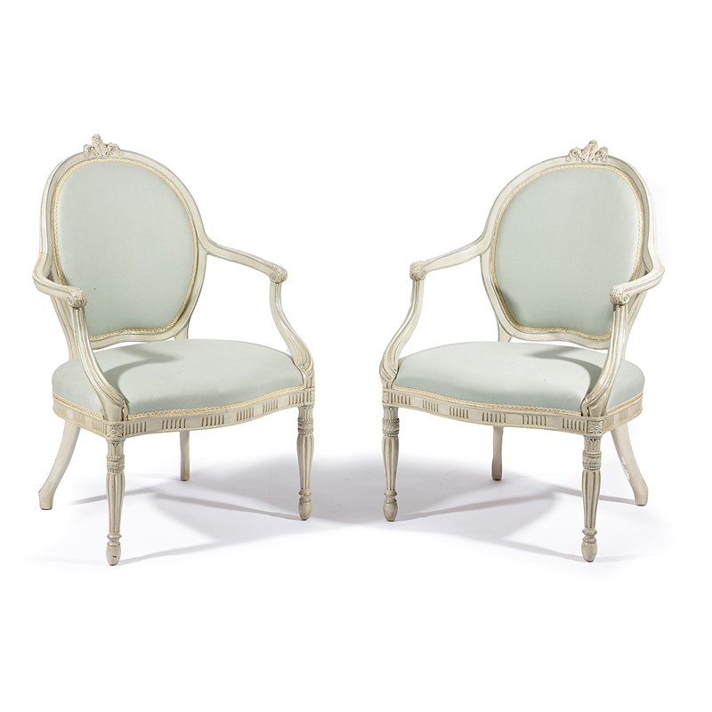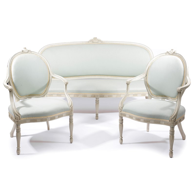 A GEORGE III PAINTED SETTEE AND MATCHING ARMCHAIR