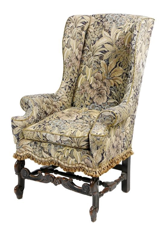 A Queen Anne style wing armchair, upholstered with floral tapestry, on ebonised beechwood scroll front legs, united by a fore-rail and block and turn stretchers, early 18th century elements.