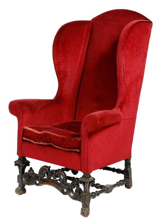 A Queen Anne and later japanned beechwood wing armchair, upholstered with burgundy plush fabric, on leaf and scroll carved tapering front legs with Braganza feet, united by a scroll arched fore-rail and block and turned stretchers.