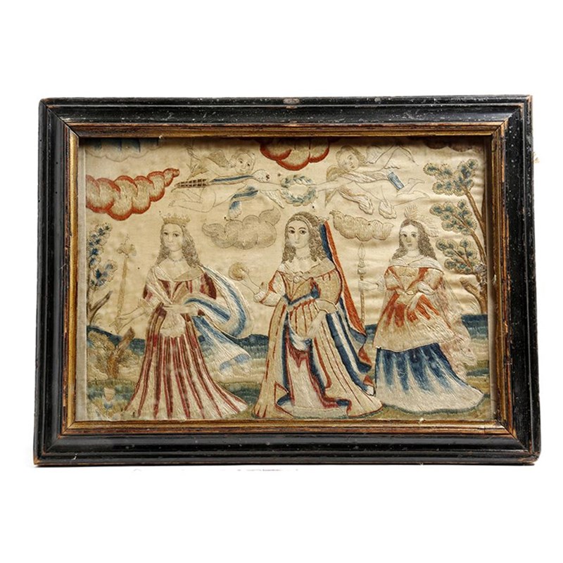 A late 17th century silkwork embroidered picture, depicting the 'Judgement of Paris', with a pair of angels crowning the victor with a laurel leaf, 20.5 x 29cm, in a later glazed ebonised and gilt moulded frame.