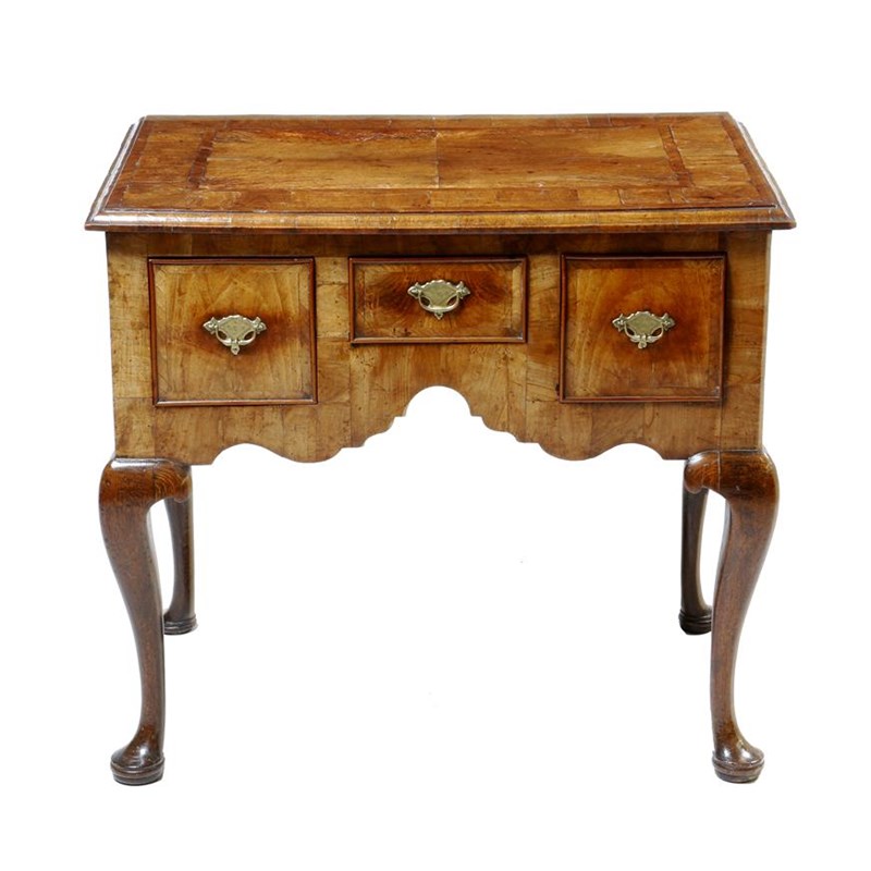 A George II walnut lowboy, the quarter veneered and crossbanded top with a moulded edge, above three frieze drawers and on oak cabriole legs and pad feet, 71.7cm high, 81.3cm wide, 53.5cm deep.