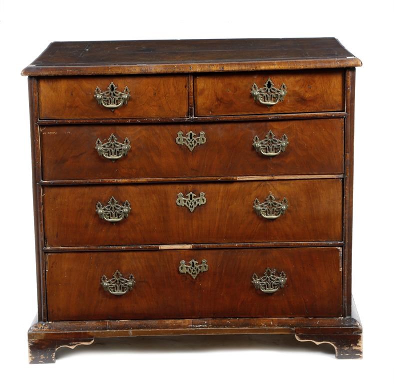 An early 18th century walnut chest, the quarter veneered top with cross and feather banding, above two short and two long drawers, on later bracket feet, 87.6cm high, 97.6cm wide, 57.3cm deep.