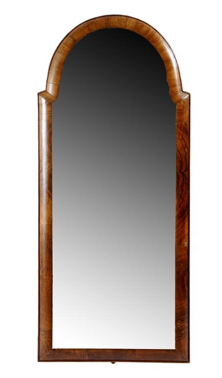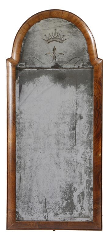 A George I walnut pier mirror, with arched bevelled plates, etched with a coronet and a fleur-de-lis motif, within a moulded frame, 113.4 x 49.5cm.