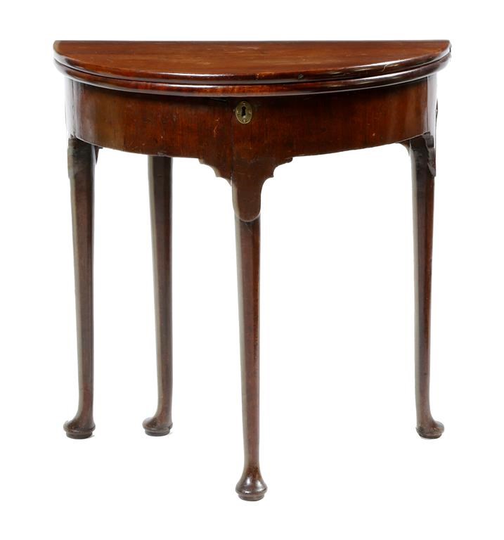 An early George II walnut demi-lune tea table, the twin hinged top revealing a vacant compartment, on a single gate support, on turned club legs and pad feet, 71.8cm high, 68.5cm wide, 38.7cm deep.