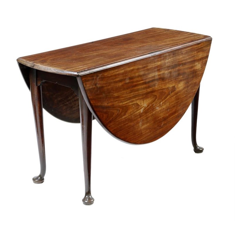 A George II mahogany drop-leaf dining table, the oval top on turned club legs and pad feet, 71.5cm high, 116 x 138cm (open).
