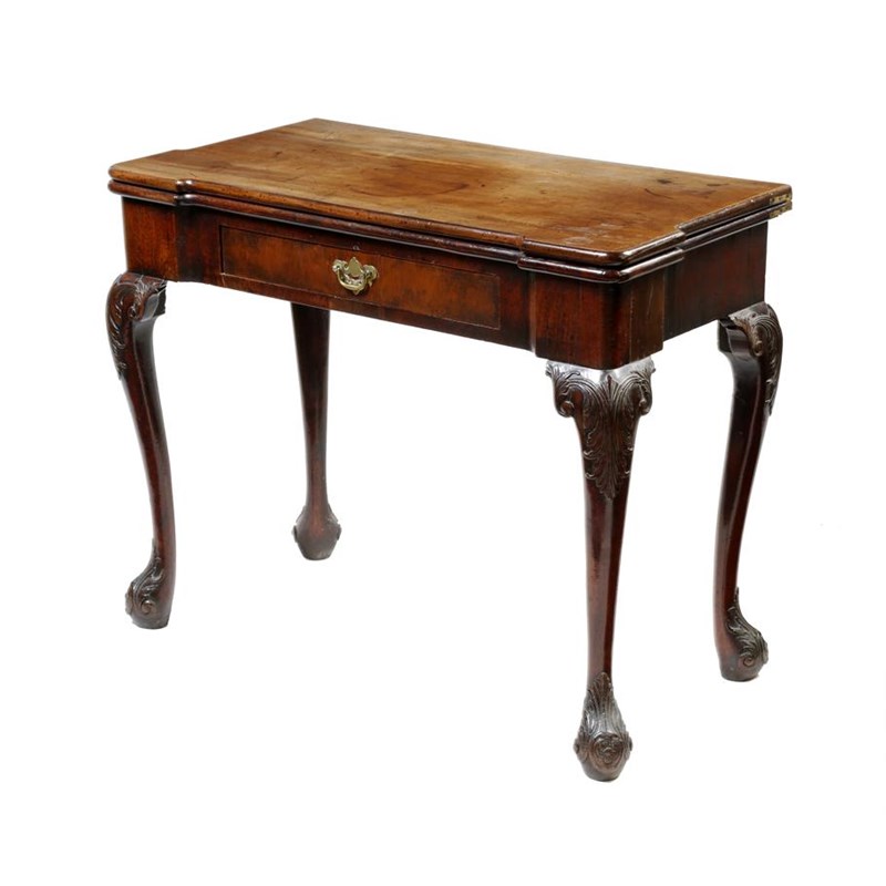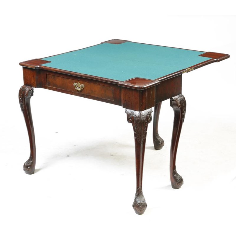 A George II mahogany card table, the rectangular hinged fold-over top with protruding corners, revealing a baize lined playing surface with candlestands, above a frieze drawer and on acanthus carved cabriole legs, the scroll feet carved with a rosette within a cartouche, 71.7cm high, 90cm wide, 48.5cm deep.