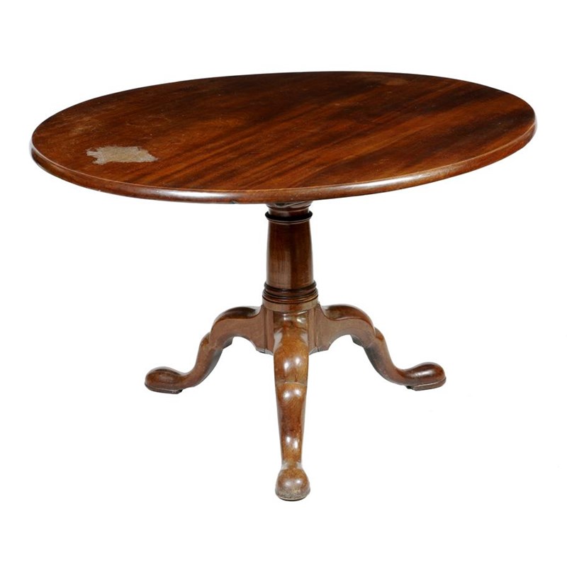 A large George II mahogany tripod table, the oval tilt-top on a gun barrel stem, on cabriole legs and pad feet, 70.2cm high, 116.3 x 102cm.