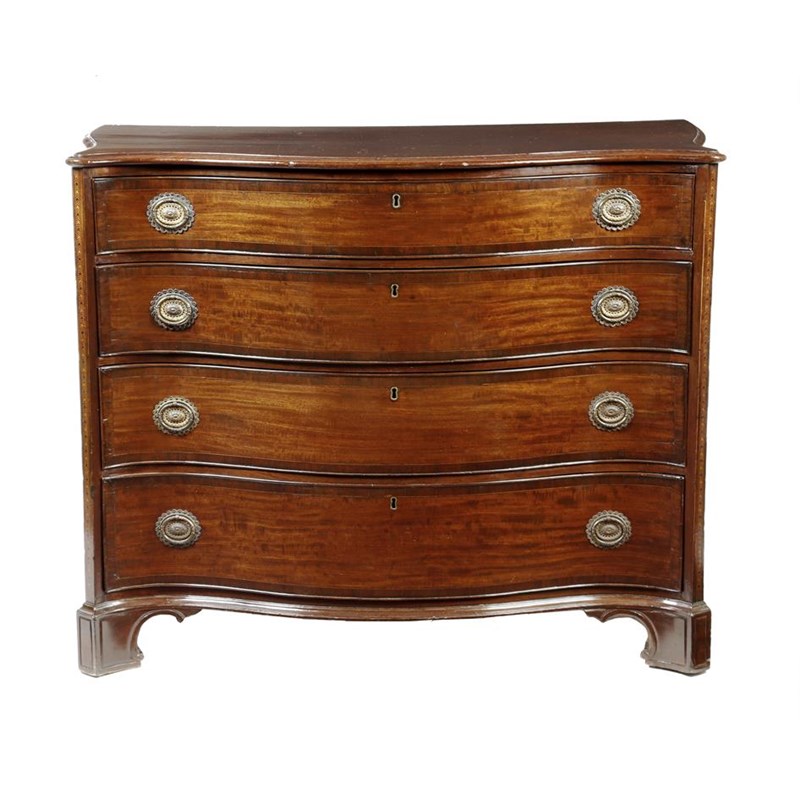 A George III mahogany serpentine chest, the top with a moulded edge, above four long crossbanded graduated drawers, the canted angles with parquetry banding and on panelled bracket feet, 97cm high, 119cm wide, 58.3cm deep.
