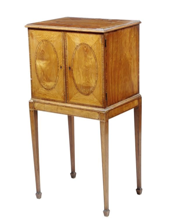 A George III Sheraton style satinwood collector's cabinet on stand, inlaid with stringing and tulipwood banding, with a pair of oval panelled doors enclosing an arrangement of eight drawers, the top two with divisions, five others with trays, with turned bone handles, the stand with square tapering legs and spade feet, 102.5cm high, 51.2cm wide, 38.9cm deep.