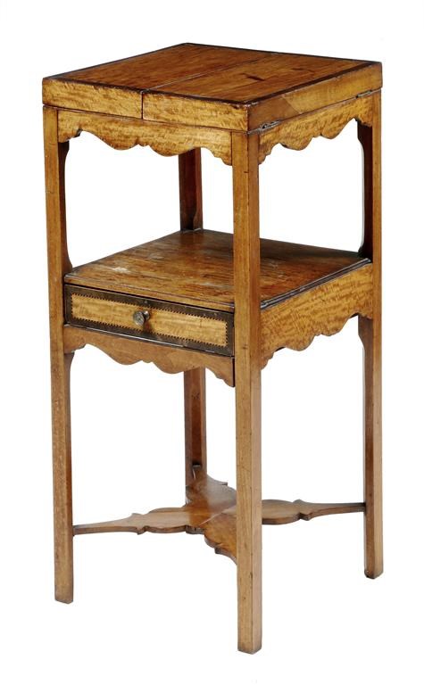 A George III satinwood square washstand, the banded twin hinged top revealing a bowl aperture within an en arc d'arbelète moulding, above a drawer inlaid with barber's pole stringing, with a shaped undertier, 82.3cm high, 36cm square.